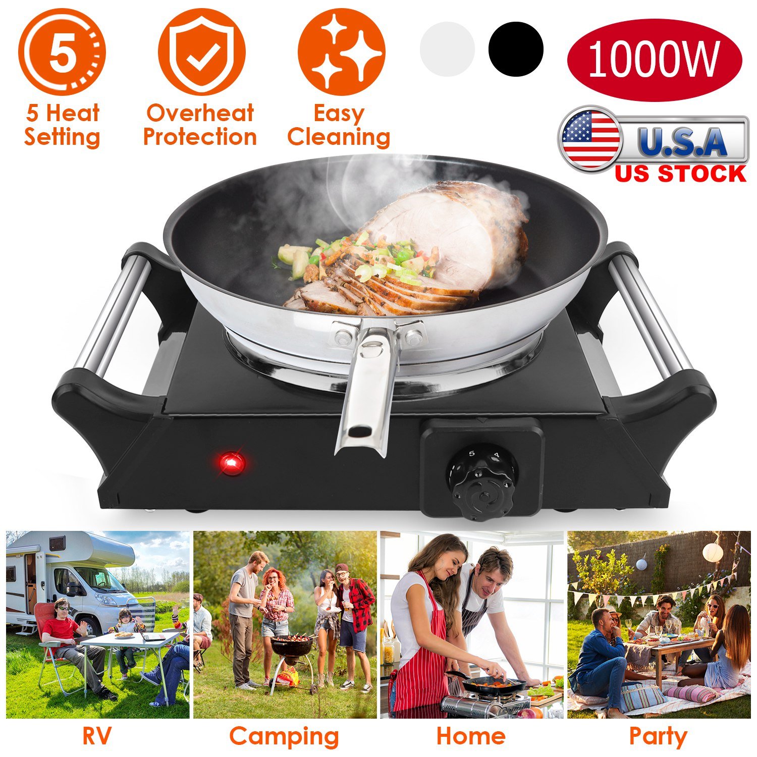 Home > 1000W Electric Single Burner Portable Coil Heating Hot Plate Stove Countertop RV Hotplate with 5 Temperature Adjustments Portable Handles