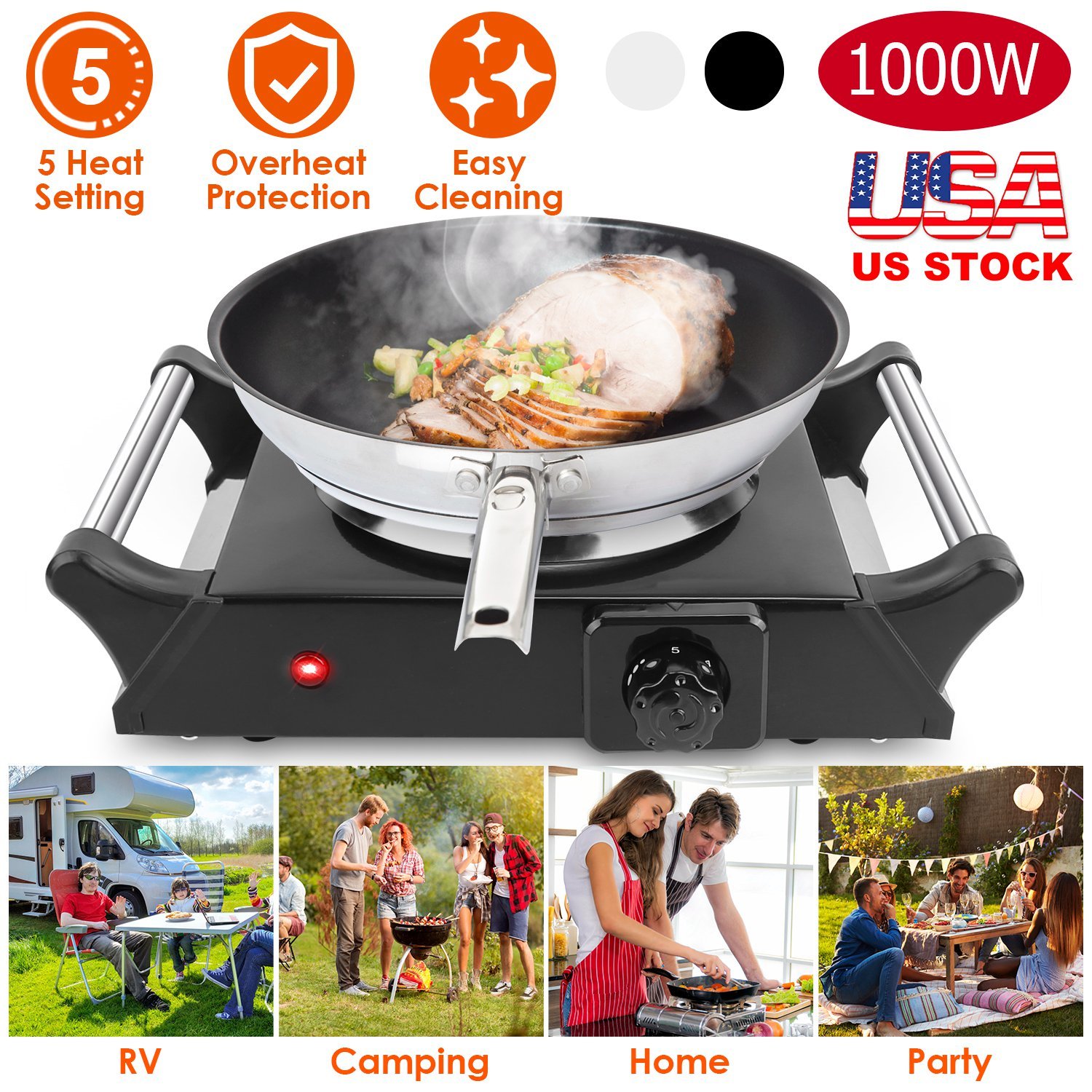 Home > 1000W Electric Single Burner Portable Heating Hot Plate Stove Countertop RV Hotplate with 5 Temperature Adjustments Portable Handles