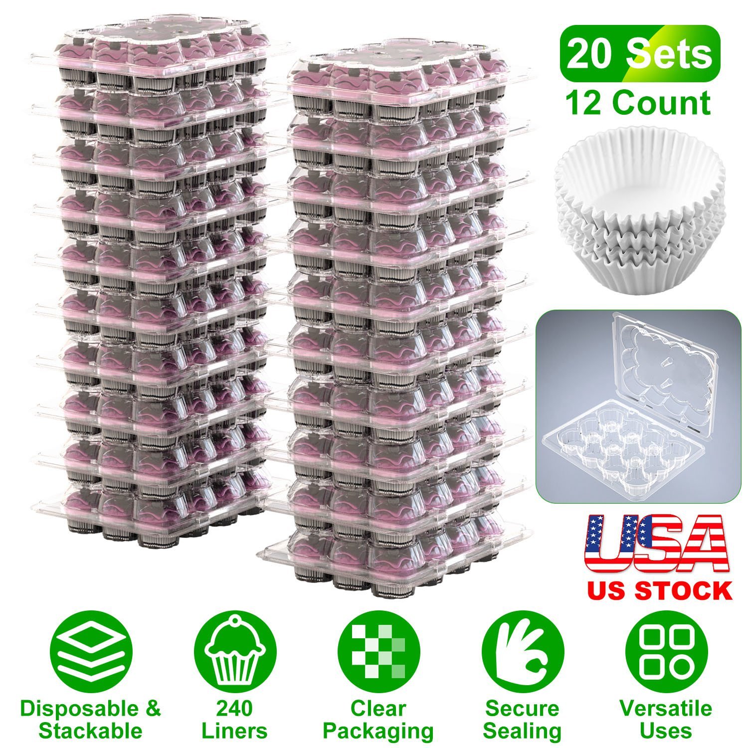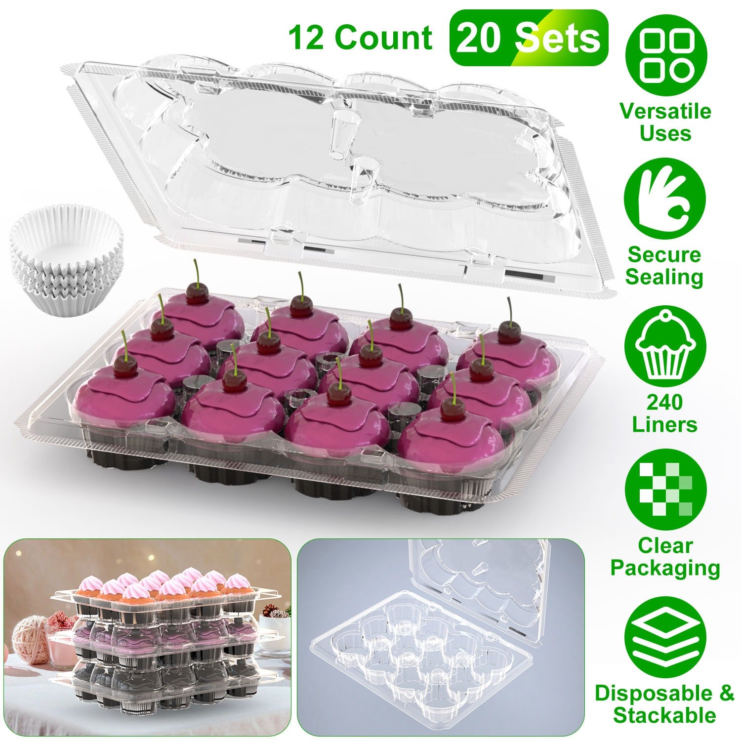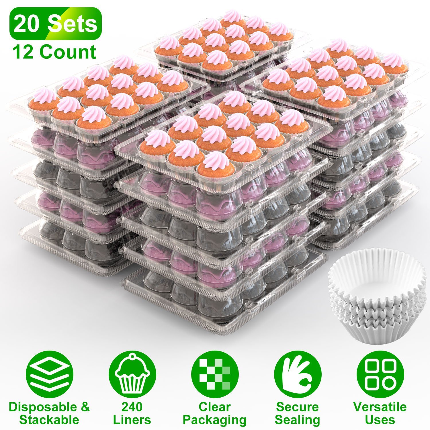 Home > 12 Count 20 Sets Clear Cupcake Boxes Disposable Cupcake Containers Stackable Cupcake Carrier Holders with 240 Liners High Dome Lid