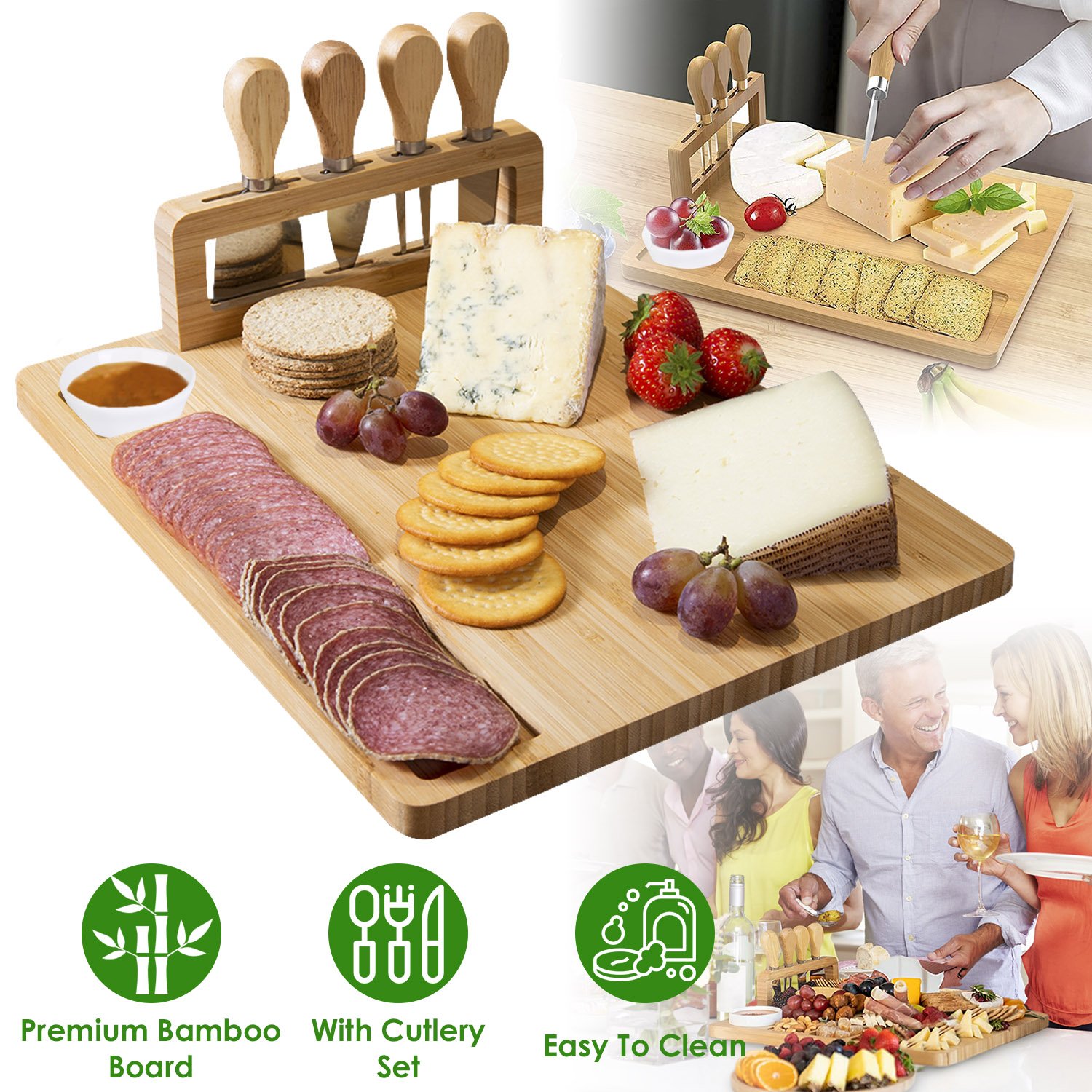 Bamboo Cheese Board Charcuterie Cheese Platter Board Serving Tray with Cutlery Set for Wedding Birthdays Christmas