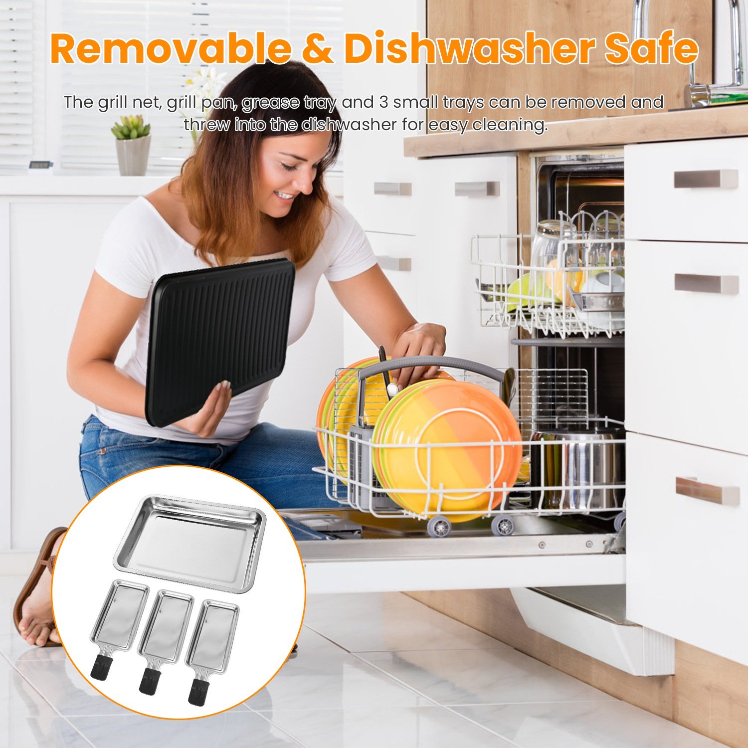 1500W Electric Indoor Grill 2 in 1 Electric BBQ Gill with Grill Net Removable Plate 5 Temperature Control 3 Small Trays Dishwasher Safe