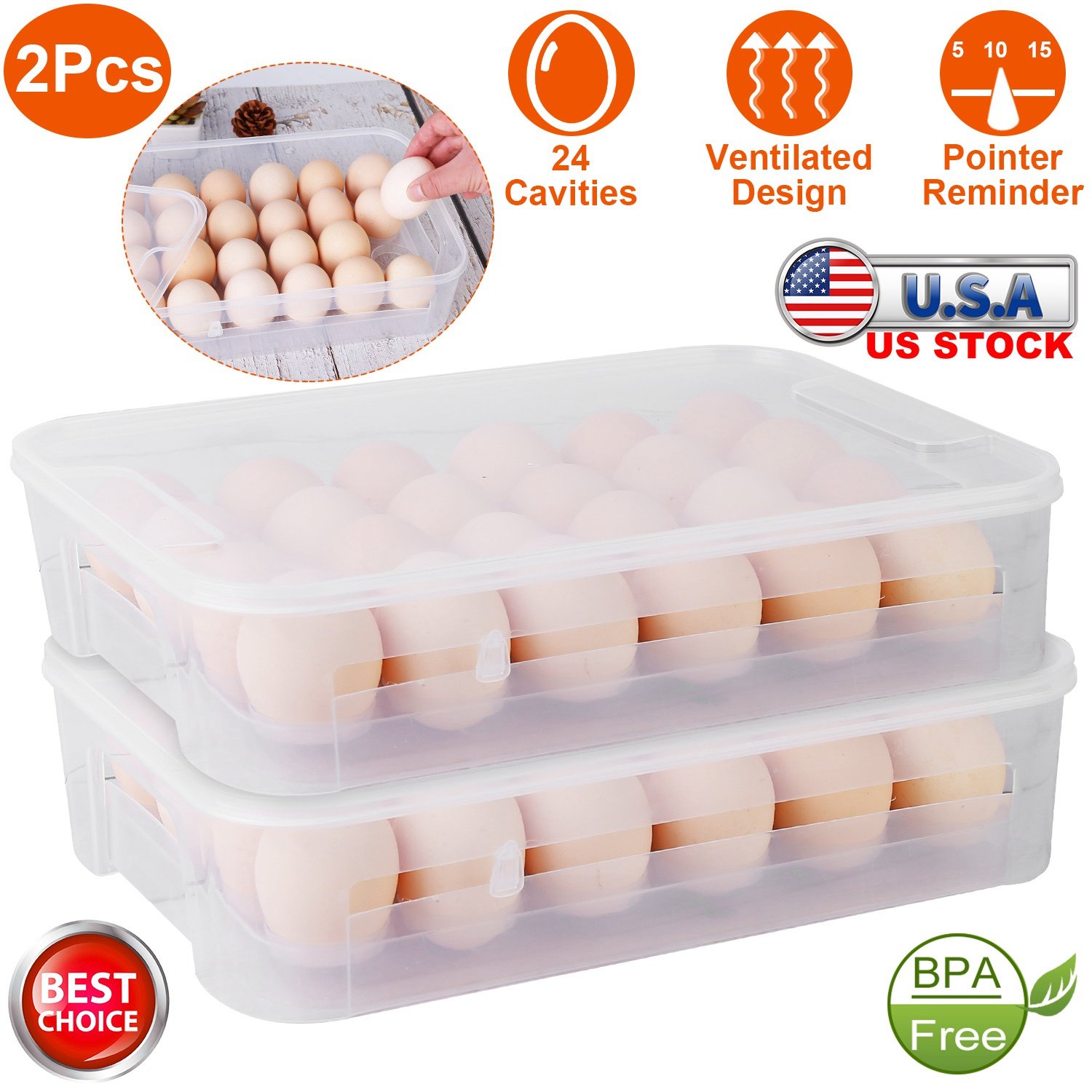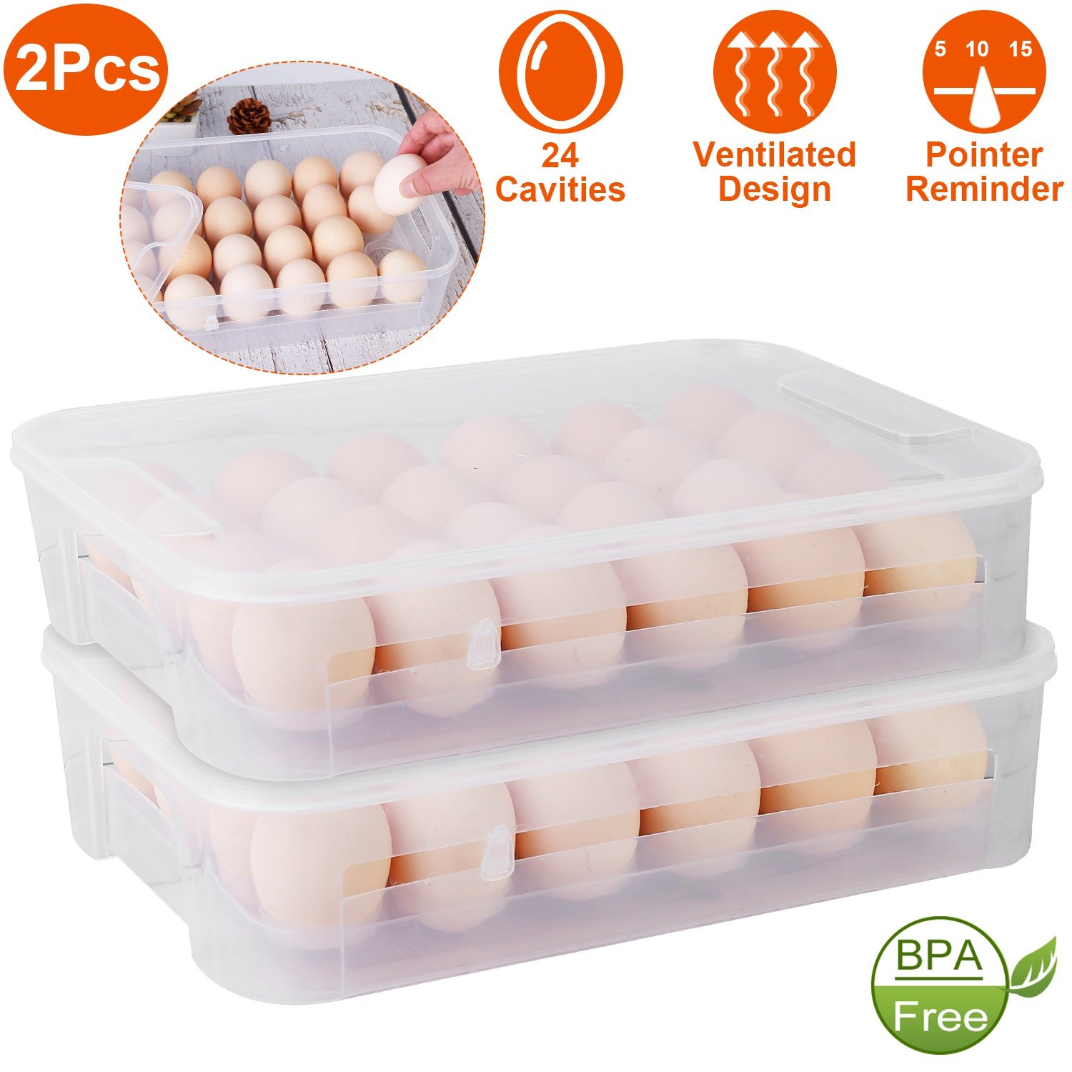 2Pcs Plastic Egg Holder Stackable Egg Storage Box Egg Rack for Refrigerator 24 Cavity Per Container