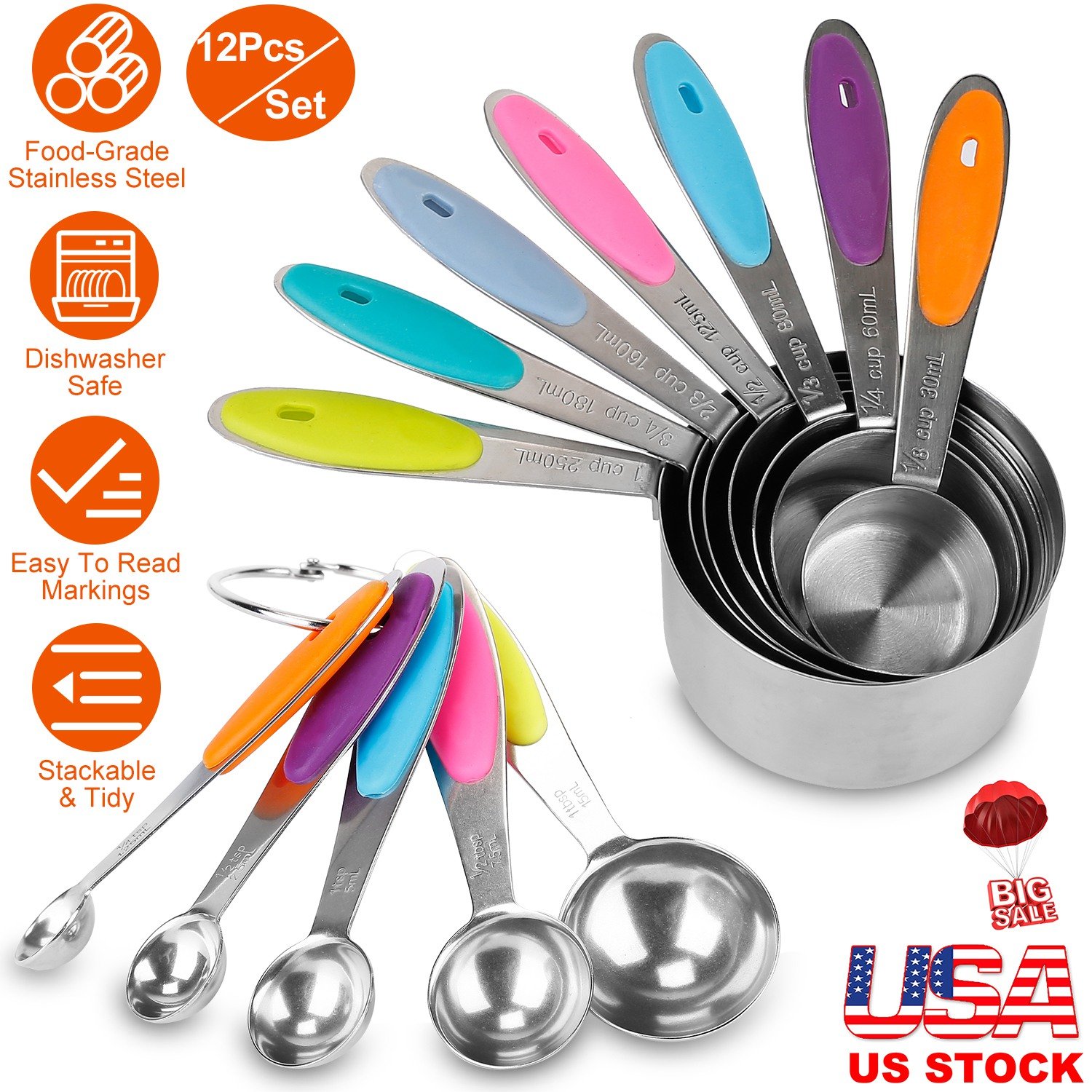 12Pcs Measuring Cups Spoons Set Stainless Steel Kitchen Measurement Tool for Cooking Baking Dry Spices Liquid Ingredients Easy to Read Markings