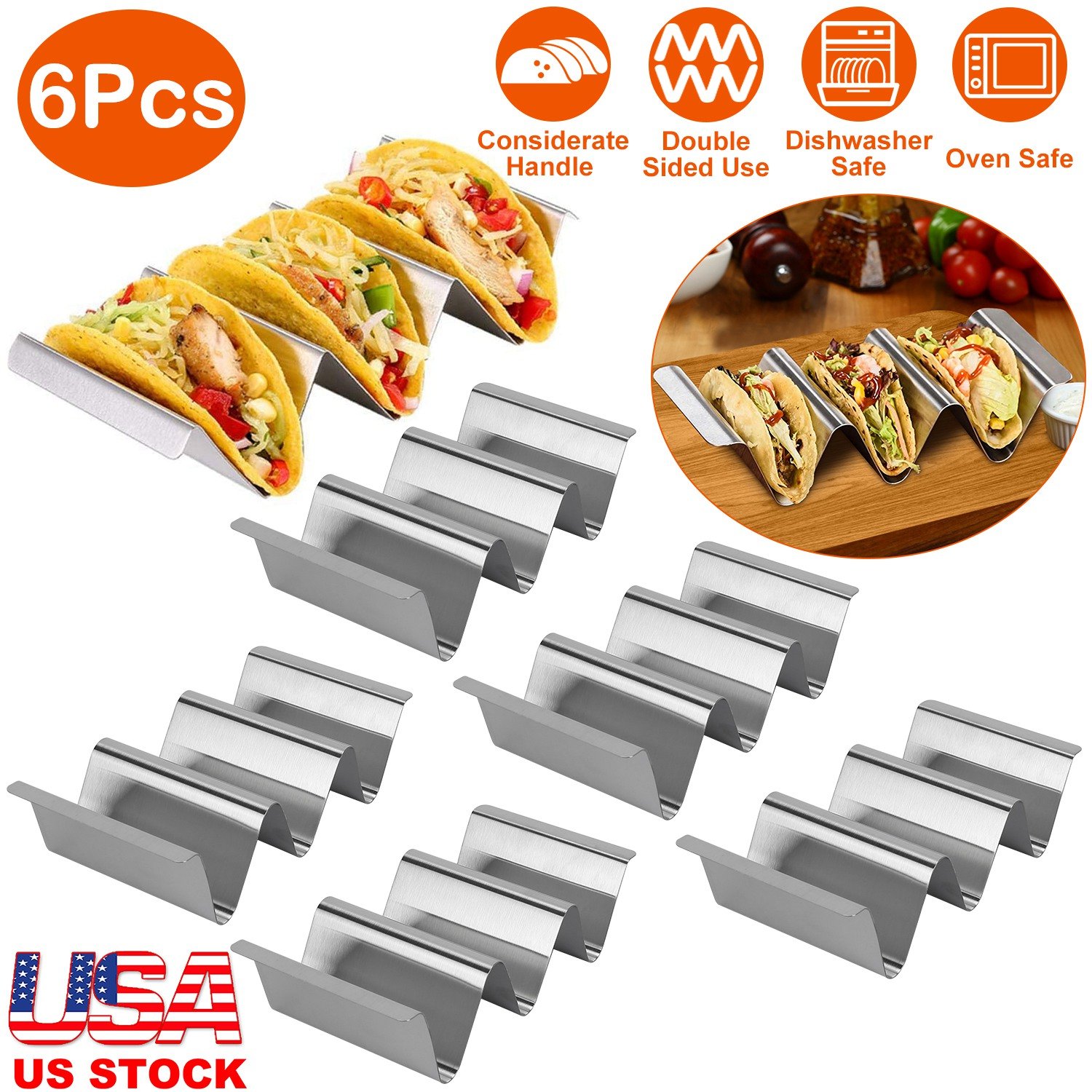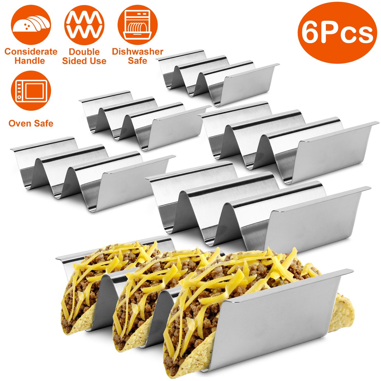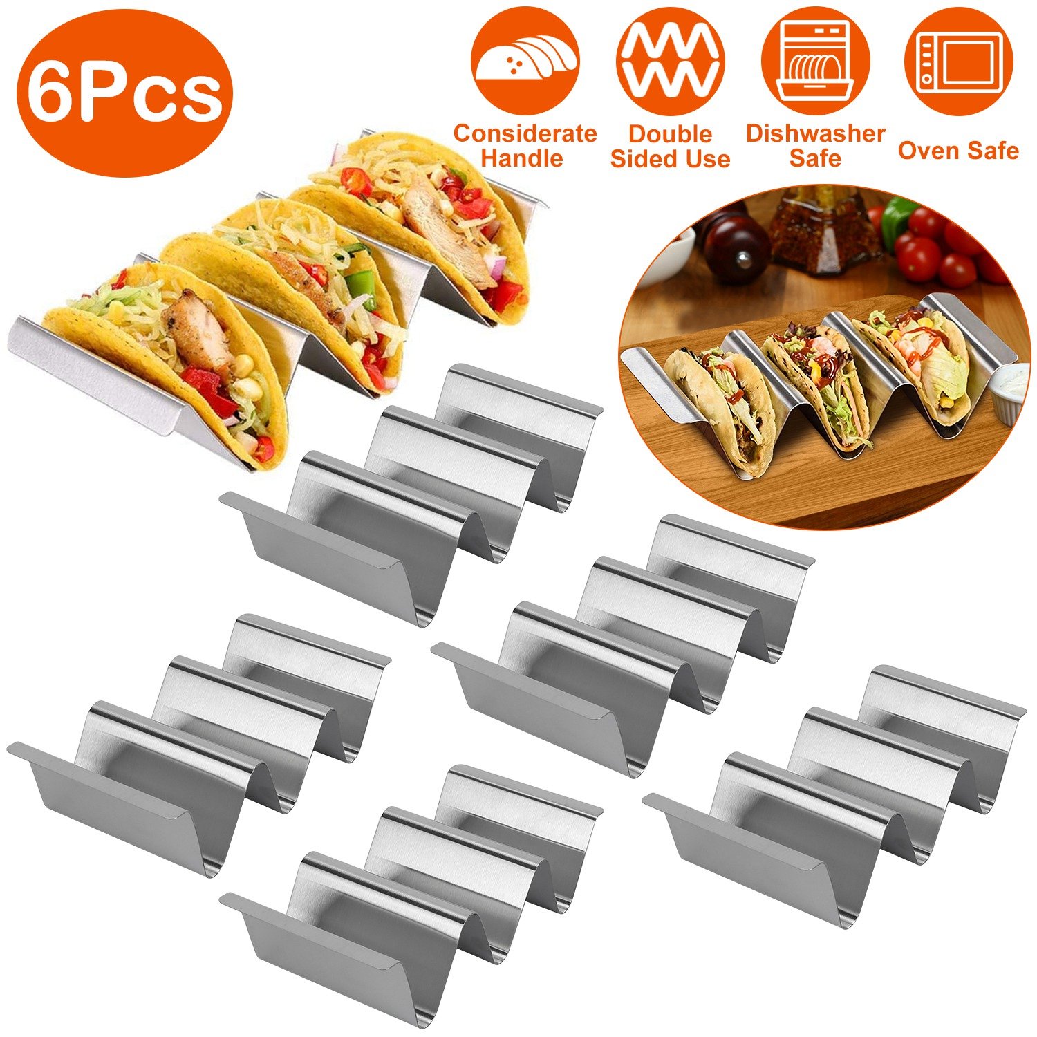 Home > 6Pcs Taco Holders Stainless Steel Taco Holder Stand Shell Rack Taco Baking Tray Plates w/ Handle Hold 2 Or 3 Tacos Safe For Dishwasher Oven Grill