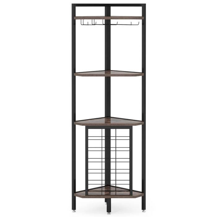 Maximize your wine space with this Rustic 4-Tier Corner Wine Rack with Glass Holder Storage! This corner wine rack astutely combines storage and display needs. Its sleek 90° design comfortably fits in various corner spaces. The rack conveniently holds 18 liquor bottles horizontally and 3 open shelf tiers for glasses, decanters, and cocktails. Equipped with 6 glass holders, it is ready for instant “home bar time”. With a textured walnut veneer and industrial black metal frame, it serves as a wine/cigar/coffee station, kitchen rack, or bookshelf. Showcasing a vintage design, it elegantly accents your living or dining room. Made from thickened MDF and durable metal frame assures stability. Adjustable feet protect the floor and a secure strap provides wall mounting for added safety.