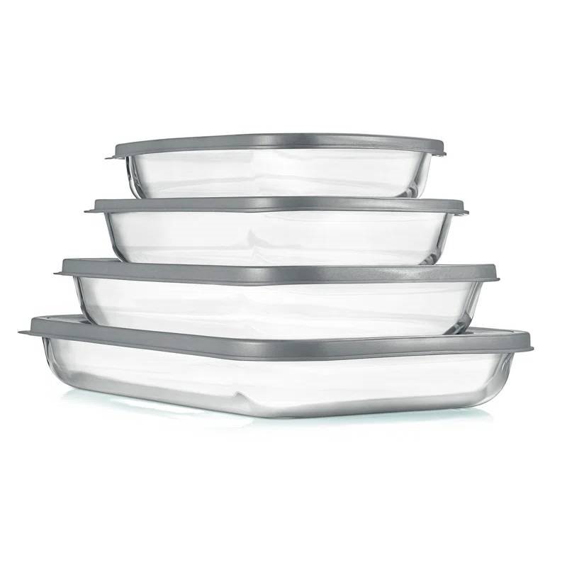 • Set of 4 - Rectangular Oven Safe Glass Bakeware Set with Grey Plastic Lids