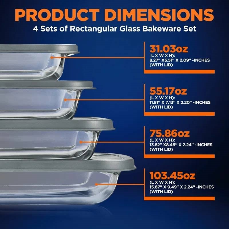 This Set of 4 - Rectangular Oven Safe Glass Bakeware Set with Grey Plastic Lids is a high borosilicate rectangular glass baking dish w/ gray bpa-free pe lids, freezer-to-oven home kitchen bake casserole food storage stackable tray pan, dishwasher safe. The 8-piece bakeware set offers a complete high-quality cooking or baking dish for casseroles, lasagna, or storing leftovers. Includes 0.9-quart, 1.72-quart, 2.4-quart & 3.2-quart capacity baking dishes with 4 BPA-free lids. Made from high borosilicate glass which is more resistant to thermal shock than other types of glass, it is also chemical-resistant & acid degradation making it the safest choice for your cooking and baking needs. Heat-safe even at high temperatures of up to 968°f which is ideal for baking several tasty baked goods or pastries. Make the most delicious chocolate fudge, cookies, brownies, and casseroles, and can also be used as a serving tray. The commercial-grade restaurant quality kitchen bakeware features a non-slip design to prevent kitchen accidents. Also stain-resistant, easy to clean & dishwasher safe but hand washing is recommended to extend pan life. The reusable professional baking set features a space-saving stackable wide tray pan design for convenient storage. It is fully compatible with standard & convection ovens. Suitable for oven, microwave, refrigerator & freezer.