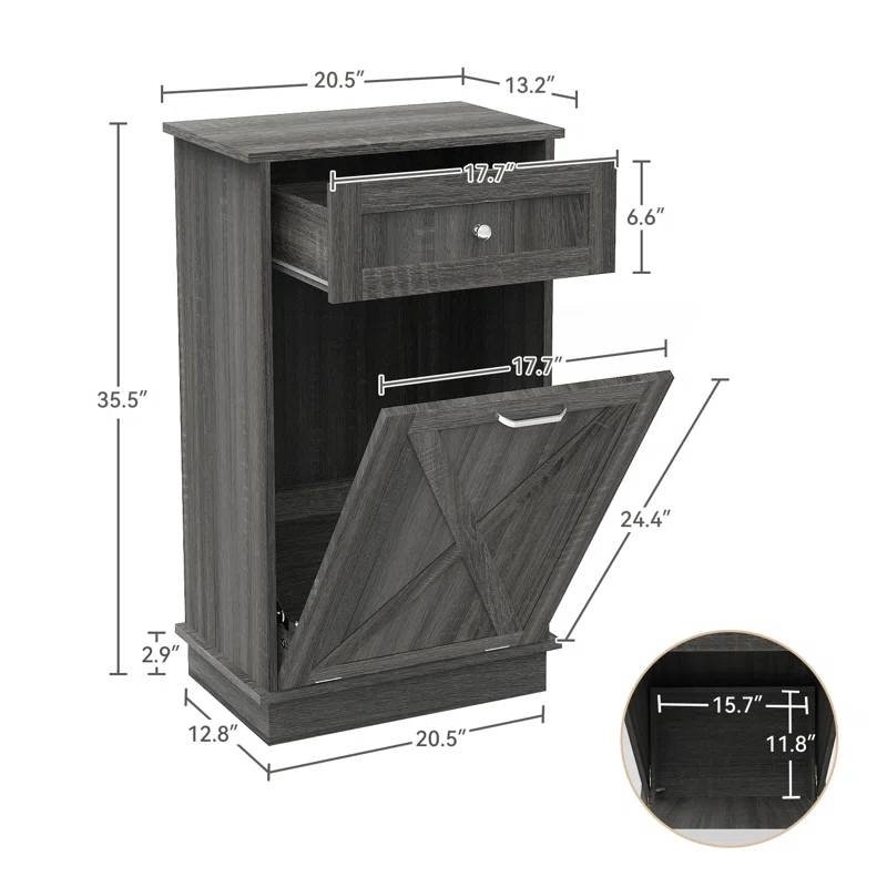Versatile and stylish, our Odor Seal Trash Can Cabinet in Grey Finish - Accommodates 10-Gallon Trash Bin is more than just a kitchen trash can. Use it as a laundry basket, recycling bin, pet food storage, or potting table. With an extra drawer for trash bags and small items, it's the perfect addition to elevate any space.